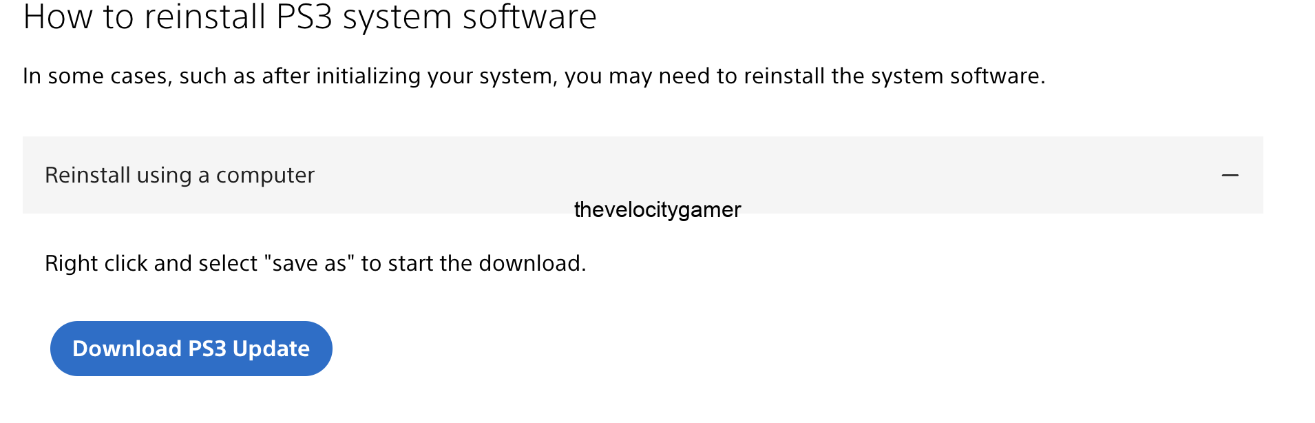 • Download the official PS3 firmware from the PlayStation website by clicking Reinstall Using a Computer, then right-click Download PS3 Update and save the file.